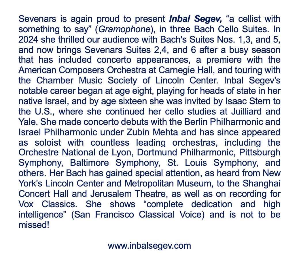 August 3rd at 4PM: Cellist Inbal Segev in Bach Suites,